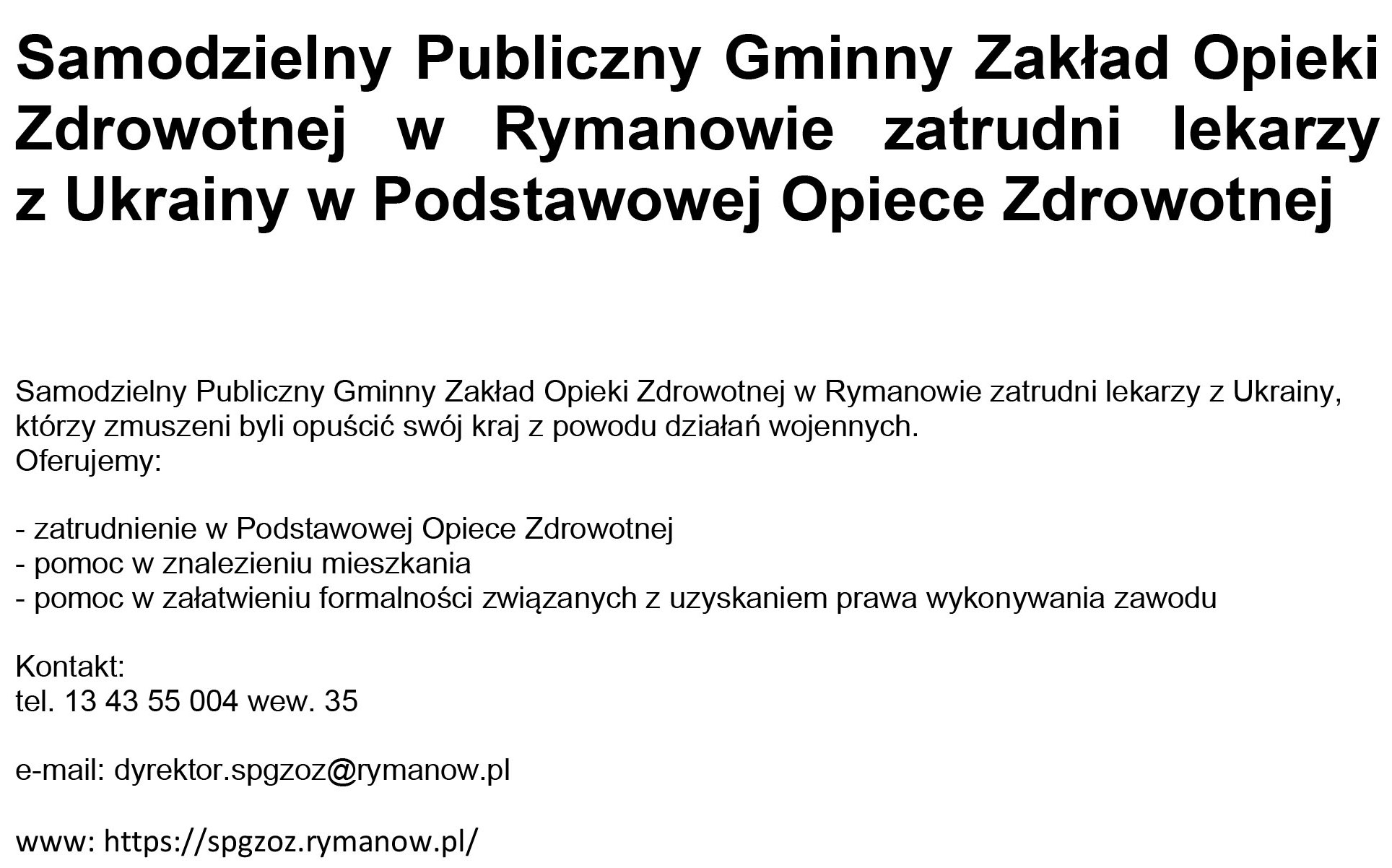 Rymanów: Podstawowa Opieka Zdrowotna: tel. 13 43 55 004