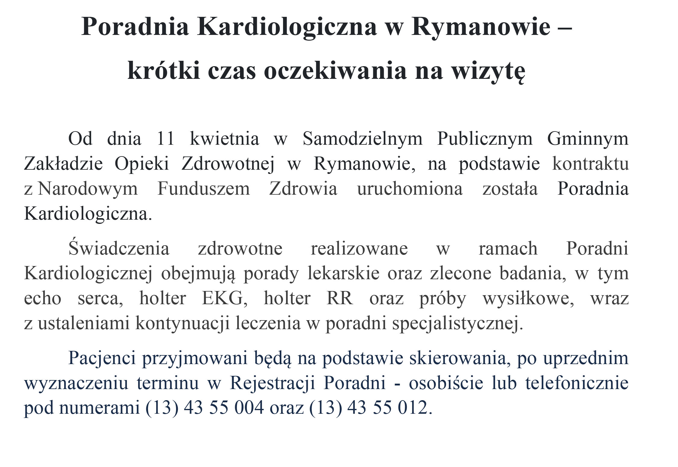 Rymanów: Podstawowa Opieka Zdrowotna: tel. 13 43 55 004